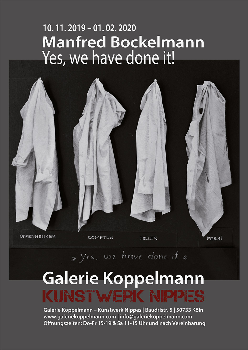Der aktuelle Ausstellungstitel „Yes, we have done it!“ ist wörtlich zu nehmen: Einerseits steht er für den Schaffensdrang der Galerie Koppelmann, die sich innerhalb von 40 Jahren als wichtige Institution in der Kölner Kunstszene etabliert hat. Andererseits verweist der Titel auf die künstlerische Arbeit Manfred Bockelmanns, welchem die Galerie zu ihrem Jubiläum eine Einzelausstellung widmet. Die Rauminstallation des österreichischen Malers und Fotografens reflektiert die Entwicklung der Atombombe durch die Wissenschaftler um Robert J. Oppenheimer. Aus unschuldiger Wissenschaft wird die bedrohlichste Waffe der Welt. Insbesondere heute von beunruhigender Brisanz, appelliert Bockelmanns Werk an die Verantwortung von uns allen. Eine weitere Version seiner Installation ist noch bis zum 23. November unter dem Titel „Yes, we have done it. Los Alamos –The Manhatten Project“ auf der Biennale del Arte 2019 in Venedig im Palazzo Bembo des European Culture Center zu sehen.