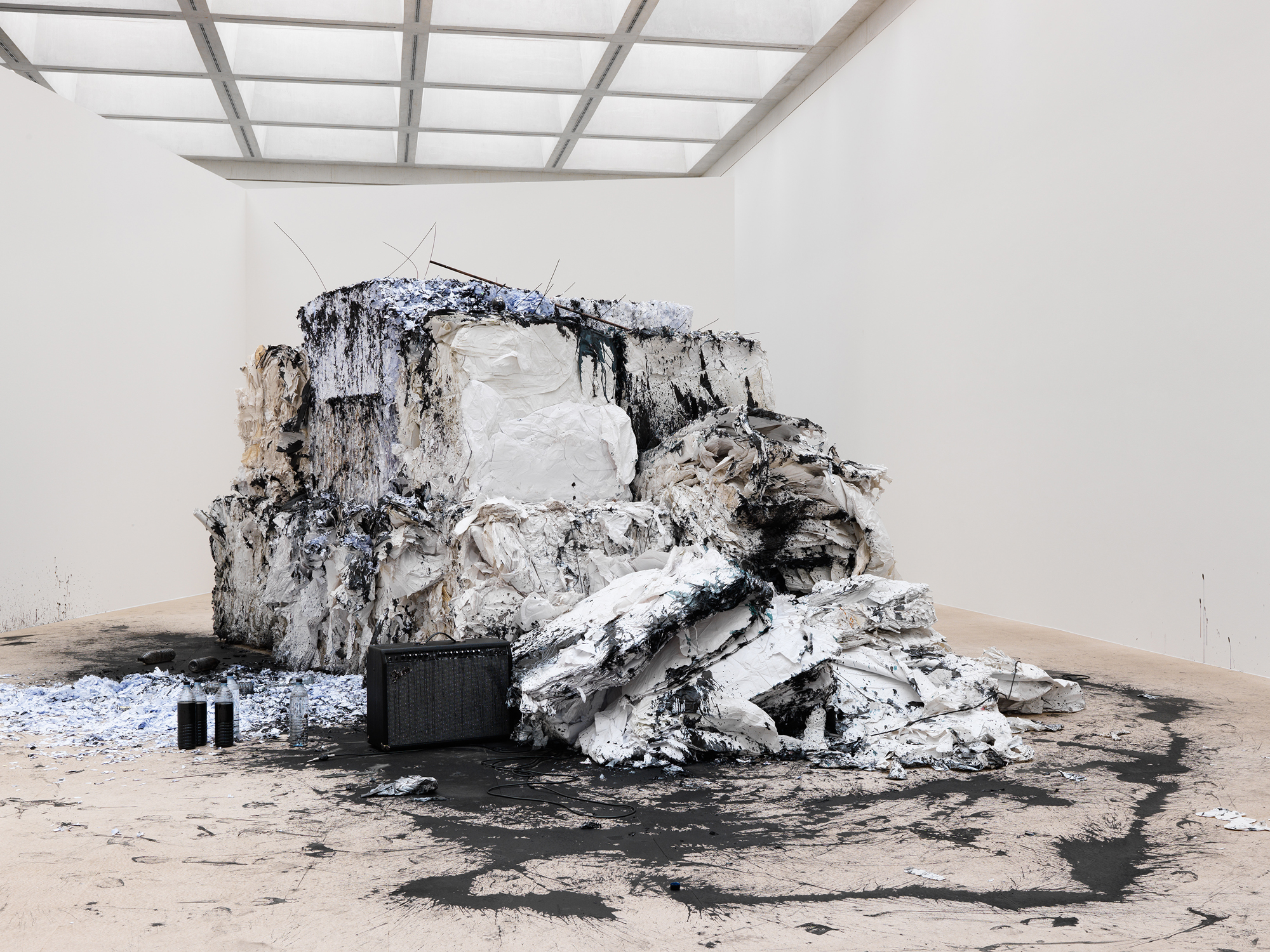 Am Eröffnungsabend und während des gesamten Wochenendes arbeitet auch Ax mit dem Material. Sie verformt es plastisch durch die Beigabe von Wasser oder die Verwendung flüssiger schwarzer Tusche. In einem Akt, der mit gewaltvoller Zerstörung, Manipulation und Veränderung verbunden ist, werden die Papierballen zerpflückt und in beiden Räumen plastisch weiterverarbeitet.