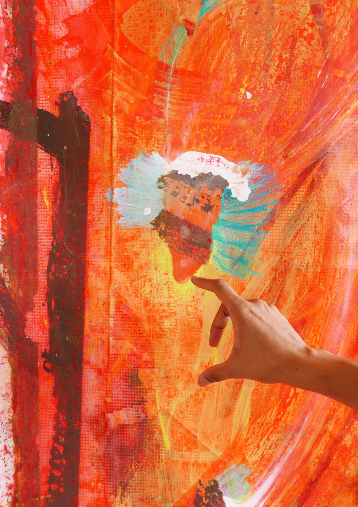 Rote Farbtropfen, die sich von ihrem Untergrund abzustoßen scheinen. Wie Fett im Wasser – ein Zustand so fragil, dass er sich gegen seine Konservierung sträuben müsste und doch ist er hier wie in einer Momentaufnahme festgehalten. Dazu milchig-rauchige Schlieren, ohne klare Grenzen, beinah materiallos. An den Rändern Farbfetzen wie überschüssige Haut. Schmutziges Braun schlägt Blasen und trifft auf schreiend grelles Grün. Oder Neonpink auf kräftiges Hellblau. An anderer Stelle sammelt sich inkarnatrote Flüssigkeit in leichten Falten und Vertiefungen zu Lachen, gerinnt und bricht auf: der Saft der Malerei.