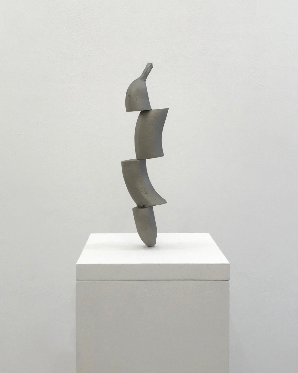 Auch die Skulptur einer Banane ist zwar aus einem Guss, dennoch wurde der Zinnabguss von vier zusammengesetzten Stücken unterschiedlicher Bananen gefertigt – allerdings unter Beibehaltung der natürlichen Ordnung der Abschnitte. Diese vier gegeneinander verschobenen, verrutschten Teilstücke sind in einem prekären Balanceakt vereint, slapstickhaft ringen sie um Gleichgewicht. Mit einem verschmitzten Augenzwinkern scheint Houlihan bildhauerische Überlegungen zu Statik und Stabilität, sowie ein symmetrisches Austarieren zu parodieren.