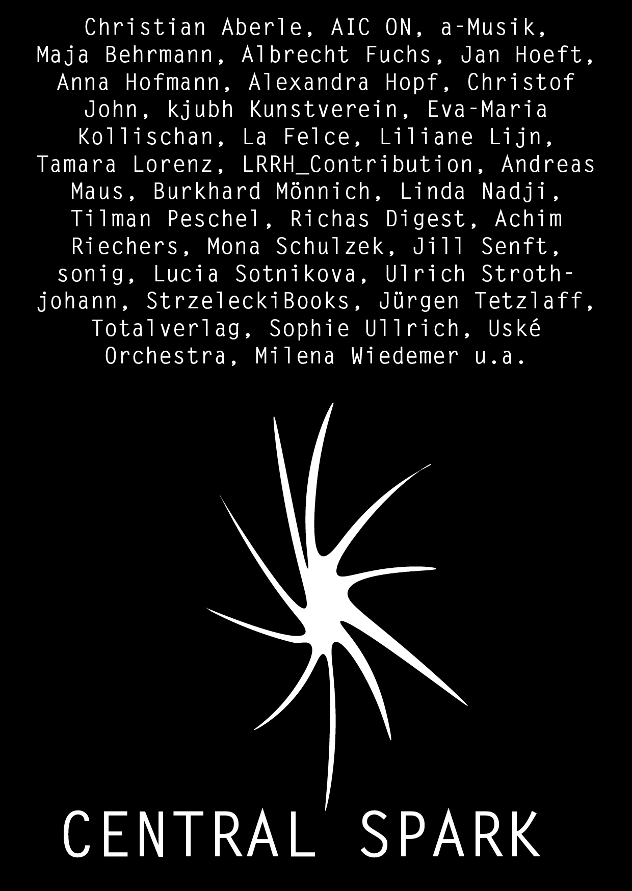 The spark has jumped: Inspired by the cooperative idea of the AIC ON festival of Cologne project spaces in early summer, ZERO FOLD presents a group show that takes up the networking impulse of the festival. Together with a selection of artists and colleagues with whom ZERO FOLD has already collaborated, editions, artists‘ books, music carriers and the like will be presented for eight weeks under the title CENTRAL SPARK, in particular „special formats“ in the context of artistic production that the artists, publishers and project spaces have created, published, or presented, in order to represent their own program as well, at least in a tiny section and with bundled energy.