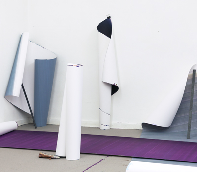 Farbe erscheint in Elisabeth Sonneck Bildern und Installationen als vieltoniges Spektrum aus teils minimal differenzierten, teils konträren Farbwerten. Der Farbauftrag ist mittels langsam freihand gezogener Pinselbahnen direkt an die physische Reichweite der Künstlerin gebunden. Die körperlichen Bedingungen des Malaktes werden sichtbar, ebenso der zeitliche Faktor in den rückläufigen Stopp-Stellen der Pinselzüge, die den von Moment zu Moment sich entwickelnden Prozess der Farbfindung zeigen. Entwicklung – im wörtlichen Sinne – und Veränderbarkeit bestimmen auch die Farbe-Installationen Sonnecks, die aus meterlangen, 110 cm breiten und fabrikseits gerollten, einseitig bemalten Papierbahnen bestehen. Mit deren Materialspannung balanciert sie liegende, hängende, freistehende oder auch Wand, Boden und Decke verbindende, oft spiralförmige, dynamische Formationen aus. Diese temporären Arbeiten werden präzise auf die charakteristischen Gegebenheiten des jeweiligen Raumes bezogen: das Material von Sonnecks Farb-Installationen ermöglicht Wiederverwendung in Metamorphosen. Malerei gewinnt dabei einen skulpturalen Charakter, der nicht der Festigkeit der klassischen Skulptur verhaftet ist, sondern vielmehr auf eine farbräumliche Gesamtsituation zielt. Der Betrachter ist „im Bild“ und zugleich dessen Urheber, da seine Ansichten unmittelbar mit dem individuellen Standort und Blickrichtung verknüpft sind. Diese farbräumlichen Erfahrungen und Aktionen des manuellen Balancieren finden Ihr Echo in den mehrteiligen Kleinformaten Papierarbeiten der Serie „clipage (variabel)“. Das Prinzip der Collage wird hierbei geöffnet: die einzelnen, ungeklärten Bestandteile sind jeweils durch einen Clip fixiert, zugleich an ihrem Schwerpunkt balanciert und aufgehängt. Gesten des partiellen Ummanteln geben auch hier den Arbeiten eine bisweilen zarte räumliche Ausdehnung, das in differenzierten Varianten mitspielende Papierweiß verbindet sie mit dem Weißgrund der Wand.