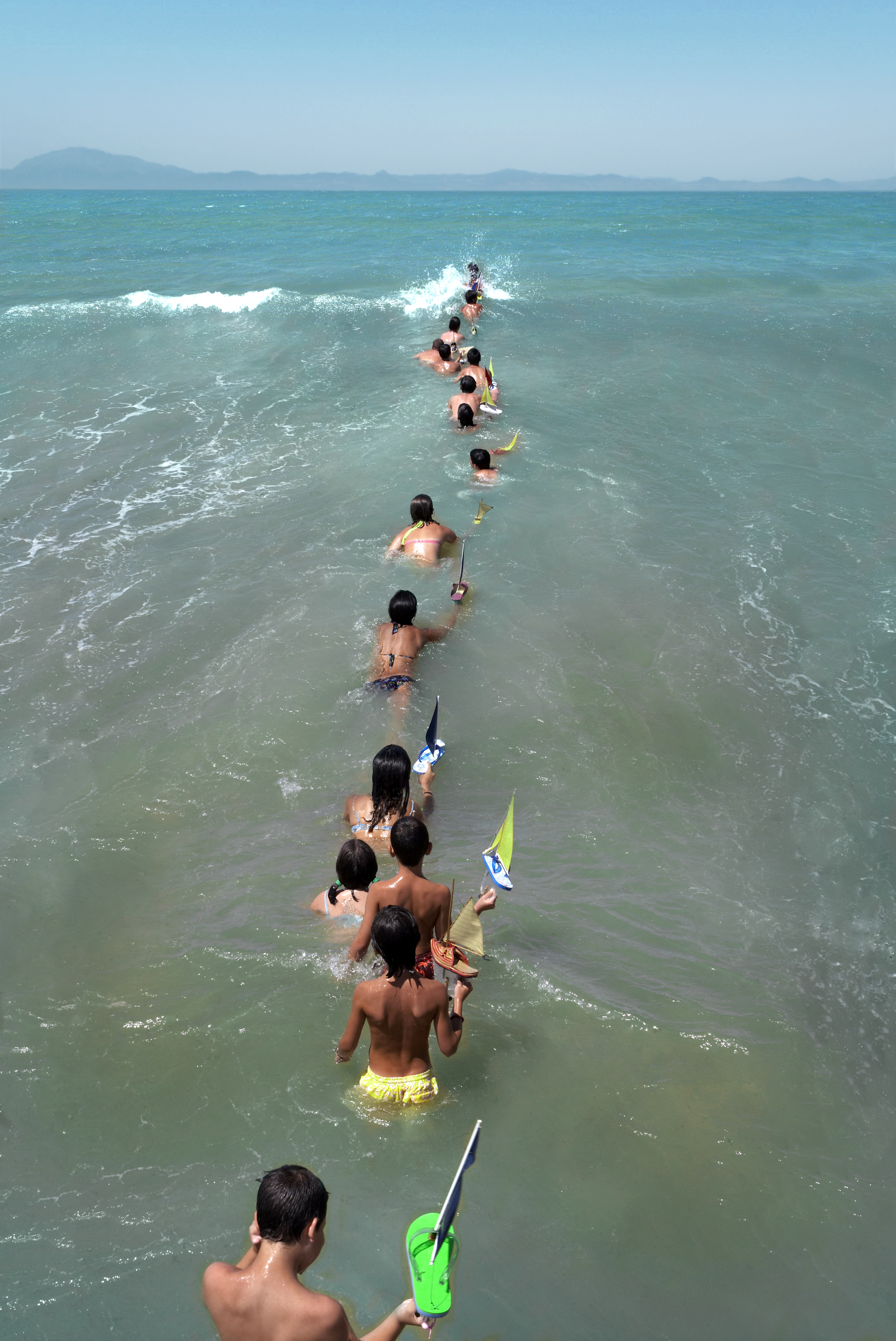 Eine Welt, in der alles mit allem verbunden ist, können wir als globalisierte Welt bezeichnen. In ihr begegnen wir über den urbanen Kontext hinaus auch auf territorialer Ebene dem Thema der Grenzziehung und damit einhergehend dem Thema der Migration. In der großen Videoinstallation sowie den sie begleitenden Zeichnungen der Serie Don’t Cross the Bridge before You Get to the River wird dies in Form einer vom Künstler initiierten menschlichen Brücke deutlich, die zugleich als eine Meta-pher für (Kolonial)Politik gelesen werden kann. Erneut zeigt sich auch hier eine Idee des Spielerischen, die entgegen westlich-kapitalistisch geprägtem Denken das Überwinden von Grenzen an die spielerischen, kooperativen Handlungen der Per-former bindet.