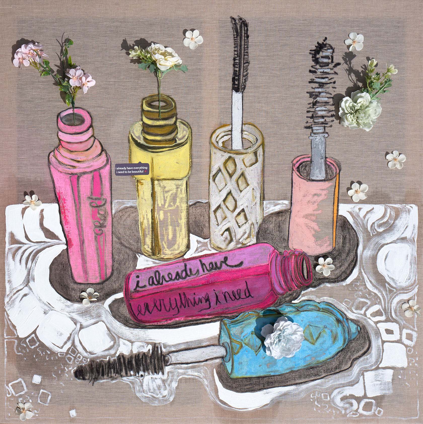 Mit Everything I Need to be Beautiful stellt Gretchen ihren zweiten großen Werkzyklus vor. Während sie sich mit ihren „Vision Boards“ auf die unkontrollierte Macht von Big Tech durch Google beschäftigte, wendet sie sich nun gegen die werbebasierten Strukturen von Facebook und Instagram und strebt eine Rückeroberung des digitalen Raumes an. Der Grundstein des Konzept sind real existierende Arbeiten in Öl auf Leinwand, die in der Galerie ausgestellt werden. Die Künstlerin erweitert das für sie charakteristische Repertoire an Plastik-Blumen, aufgeklebten Stoffen und Edelsteine, in Richtung einer figurativ malerischen Auseinandersetzung mit den Sujets, die auf tatsächlich existierenden Werbeanzeigen beruhen, und greift somit auf die Anfangszeit ihrer künstlerischen Tätigkeit bei Billy Childish zurück. In jedem der Ölgemälde findet sich eine Art Sprech- oder Produktblase, in der der Titel der Ausstellung I have already everything I need to be beautiful imprägniert ist. Sie reiht sich mit dieser Serie in die Tradition referenzieller Kunst ein, die mit Duchamps „Ready Mades“ begann und in der Pop Art ihren vorläufigen Höhepunkt erreichte. Das Referenz-Bild und die damit eng verbundene Strategie der Aneignung, hat sich jedoch — vor allem durch die Meme-Kultur — längst über den Bereich der künstlerischen Praxis hinaus als Form der Kommentierung von Alltagsgeschehen sowie politischer Strömungen etabliert. Jede Form der bildnerischen Aneignung muss immer auch vor dem Hintergrund eines Macht-Diskurses gelesen werden. Die Künstlerin beschränkt sich jedoch nicht darauf, die Ästhetik der Online- Werbung in die Sphäre der Kunst zu ziehen und diese somit aufzuwerten bzw. ihr eine gewisse Art Credibilty, garniert mit etwas Kapitalismuskritik zu verleihen. Vielmehr kapert und manipuliert sie mit dem entsprechenden technische Know-how eine der vermutlich mächtigsten und umsatzstärksten Infrastrukturen der heutigen Zeit, um deren Funktionsweise ins Gegenteil zu verkehren.