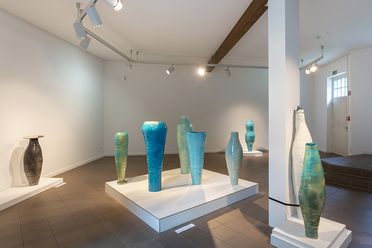 Sind ihre Zeichnungen in ihrer Ungegenständlichkeit stets ein offenes Gegenüber, ein offener Gesprächspartner, so behaupten sich ihre keramischen Skulpturengefäße als ein klares körperliches Gegenüber im Raum. Glasiert in diesem Blau als der Farbe des Himmels und des Wassers, dem Blau, dessen Vielfalt sie auf ihren Reisen durch den Nahen Osten immer wieder erlegen ist – von Kobalt bis Türkis.