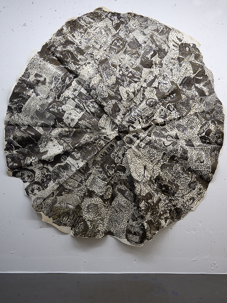 Michael Buthe war ein Wandler zwischen den Kulturen. Seine Werke sind gekennzeichnet durch die Vielfalt ihrer Materialien und Vielgestaltigkeit ihrer formalen Mittel. Das ausgestellte Papierobjekt [Ø 175 cm] ist Teil einer umfangreichen Katalogkassette mit 19 Photographien plus Graphitzeichnung auf Andruckbogen und erschien anlässlich seiner Kölner Ausstellung ‚LE DIEUX DE BABYLON‘ in 1973.