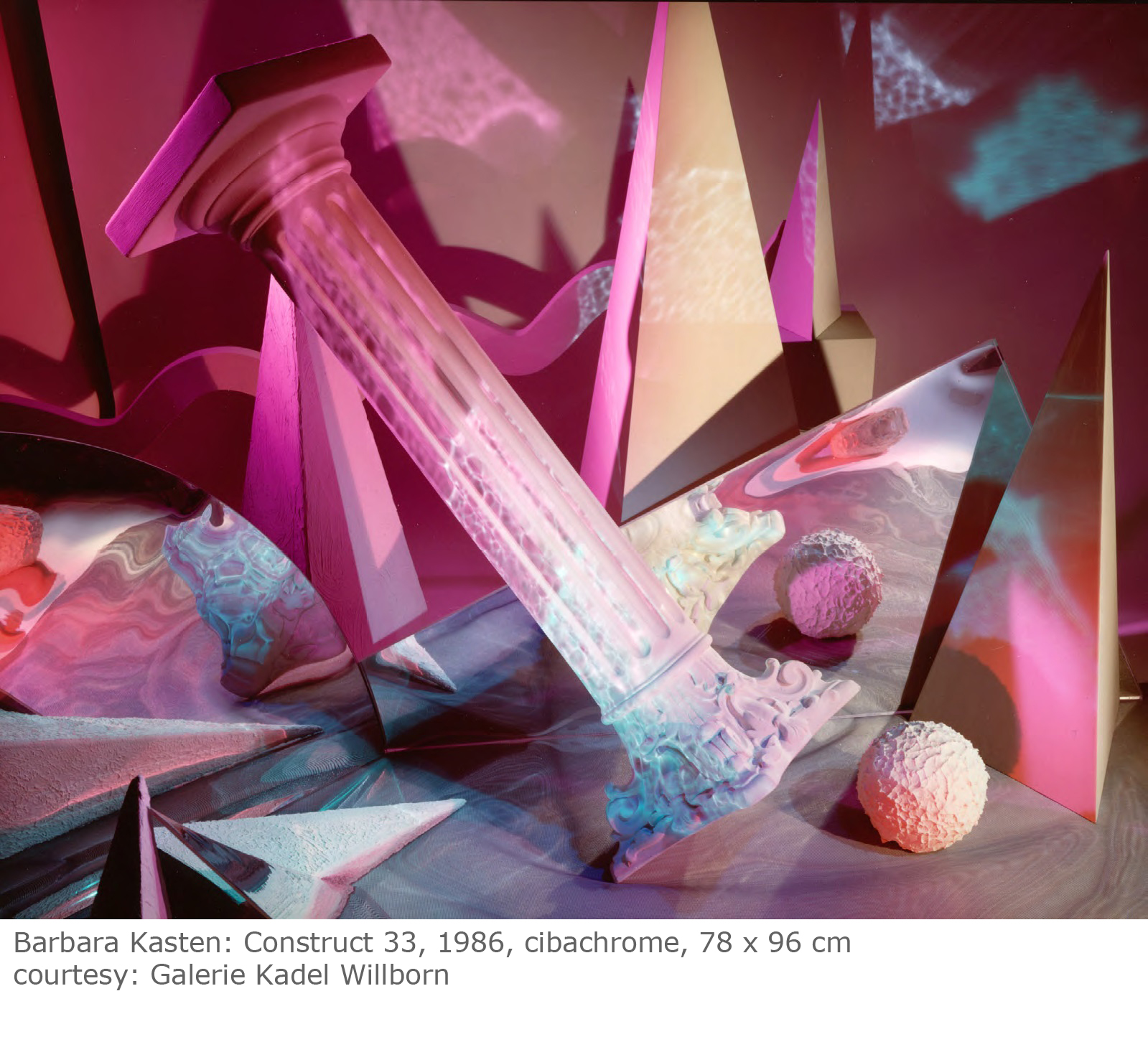 Eine Verwandtschaft zu den Entwürfen von Memphis und deren opulenten Oberflächen zeigen die kantigen Objekte Graham Littles, deren Dekor auf Muster und Formen aus der Mode zurückgeht, ebenso aber von historischen Gebäudefassaden inspiriert ist. Little überzieht seine Skulpturen mit einer illusionistisch gemalten ‚Haut‘ und erinnert auf diese Weise an die polarisierende Co-Existenz von Oberfläche und Form vieler Memphis Objekte. Eva Berendes schöpft aus dem Pool alltäglicher Gebrauchsgüter und nutzt diese als formale Elemente der Gestaltung. Ihre Assemblagen aus unterschiedlichen Werkstoffen und Objekten sind von der Flächenkomposition abstrakter Malerei inspiriert, erinnern aber ebenfalls daran, dass die Dinge Träger kultureller Bedeutungen sind. Für Tobias Rehberger ist die Grenze zwischen künstlerischem Objekt und gestaltetem Gebrauchsgegenstand dynamisch. Die Skulptur Cutting, preparing, without missing anything, and being happy about what comes next (2009) basiert auf der Vorstellung des befreundeten Künstlers Rirkrit Tiravanija über sein bevorzugtes Wohnumfeld. Nicht ohne Humor spielt Rehberger damit auf die zeitgenössische Rolle des Designs zur Erzeugung eines individuellen Lebensstils an. Ursprünge dieser Entwicklung finden sich in den Entwürfen von Memphis, die das Design von seinem funktionalen Zuschnitt entkoppelten und es als Projektionsfläche für individuelle Stimmungen und Gefühle nutzten. Das Memphis-typische Spiel mit Skalierungen zwischen Architektur und Modellhaftigkeit findet sich auch in den Gemälden Raymond Barions, dessen Motive Impulse aus Architektur und Kulturgeschichte aufgreifen und auch im Kolorit einen Hauch jener Objekte versprühen, welche die Gruppe um Ettore Sottsass hervorgebracht hat. Barbara Kasten nutzt Materialien und Objekte, u.a. aus dem architektonischen Modellbau, die sie arrangiert und anschließend fotografiert. Ihre Aufnahmen konzentrieren sich auf das ephemere Erscheinen der Dinge, die durch ihren fotografischen Blickwinkel im Wortsinn gefärbt sind. Der Vorstellung einer, von dieser subjektiven Konstruktion unabhängigen Realität entzieht die Künstlerin damit den Boden. Auch dadurch erweisen sich Kastens Arbeiten als Zeugen jener Zeit, in der sich Architektur und Design von ihrem funktionalen Auftrag lösen und in ein sinnliches Abenteuer verwandeln, welches vor allem unseren Blick und weniger unseren Körper adressiert. Neben einer Werkgruppe von großformatigen Polaroids aus den 1980er Jahren, die in Deutschland bisher noch nie gezeigt wurden, präsentiert Barbara Kasten außerdem eine eigens für KAI 10 konzipierte Installation, die auf einer Videoprojektion basiert.