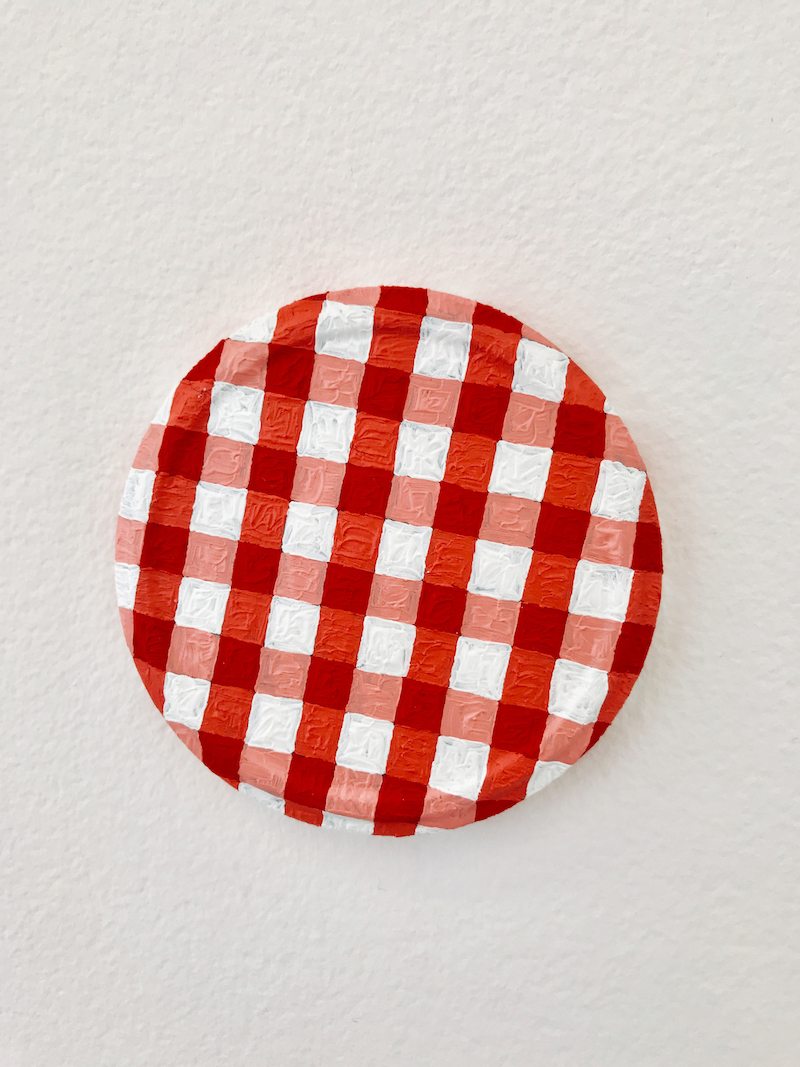 Textile Muster durchziehen das Werk der Künstlerin. In ihren Wollbildern, Malereien, Zeichnungen und Installationen untersucht die Künstlerin auf fast semiotische Art und Weise das Phänomen domestizierter Ornamente. Ihre „Musterbilder“ liefern das Bild einer Gesellschaft der Kopien, der industriellen Reproduktion. So kehren die neben anderen seriellen Arbeiten in der Ausstellung gezeigten „Deckel-Bilder“ den Aneignungsprozess der Lebensmittelindustrie um, die Vichy-Caro Muster auf Deckel von Marmeladengläsern druckt, um den Eindruck von „handgemacht“ zu erzeugen. Michelle Grabner ihrerseits gießt diese Deckelformen in Bronze und bemalt sie per Hand mit dem uns vertrauten, gediegenen Muster.