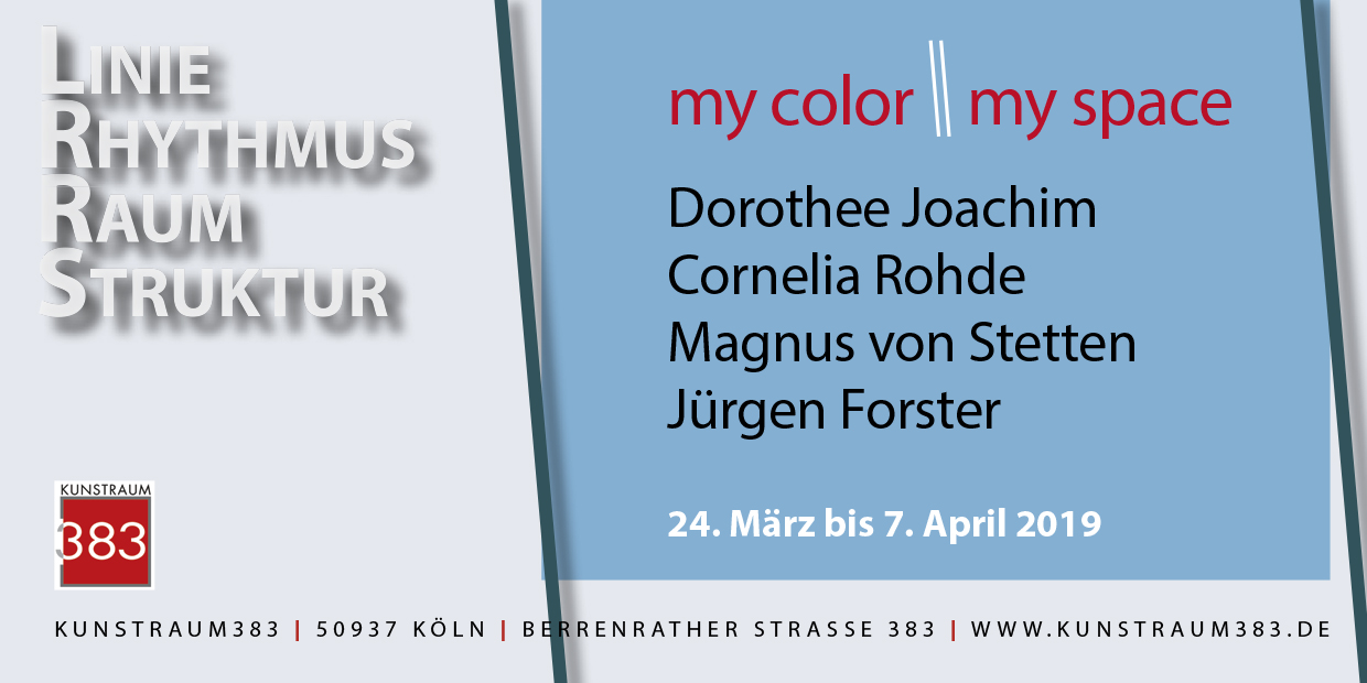 Unter dem Titel „My Color\My Space“ präsentiert der Kölner KUNSTRAUM383 ab 24. März vier Positionen zeitgenössischer Malerei und Druckgrafik. Neben Aquarell-Arbeiten der Malerin Dorothee Joachim zeigt Cornelia Rohde neue Acrylbilder aus ihrem Linienzyklus. Der Kölner Objektkünstler und Maler Magnus von Stetten ist vertreten mit farbigen Passepartout-Kompositionen, und der Druckgrafiker Jürgen Forster stellt eine Serie kleinformatiger Liniengitter-Prints aus. Die Ausstellung wird bis zum 7. April 2019 zu sehen sein.