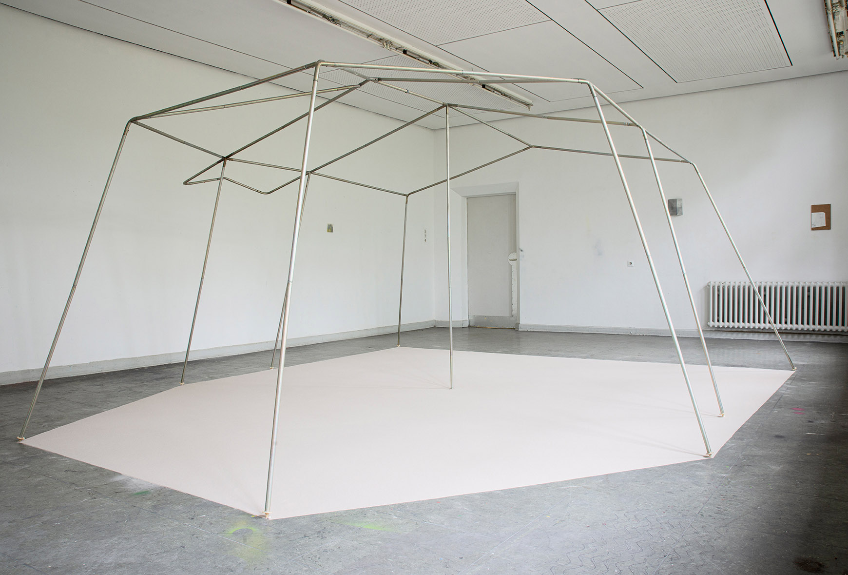 Für die Arbeit BASIS installiert Alice Musiol ein metallenes Gestänge zentral im Raum. Die objekthafte und grafische Qualität dieses Konstruktes ist sehr schnell als nacktes Zeltgestänge zu erkennen. Es ist dem Betrachter erlaubt, den Innenraum zu durchschreiten. Die nicht fixierte Markierung der Grundfläche wird dabei einem Prozess der Transformation unterzogen.