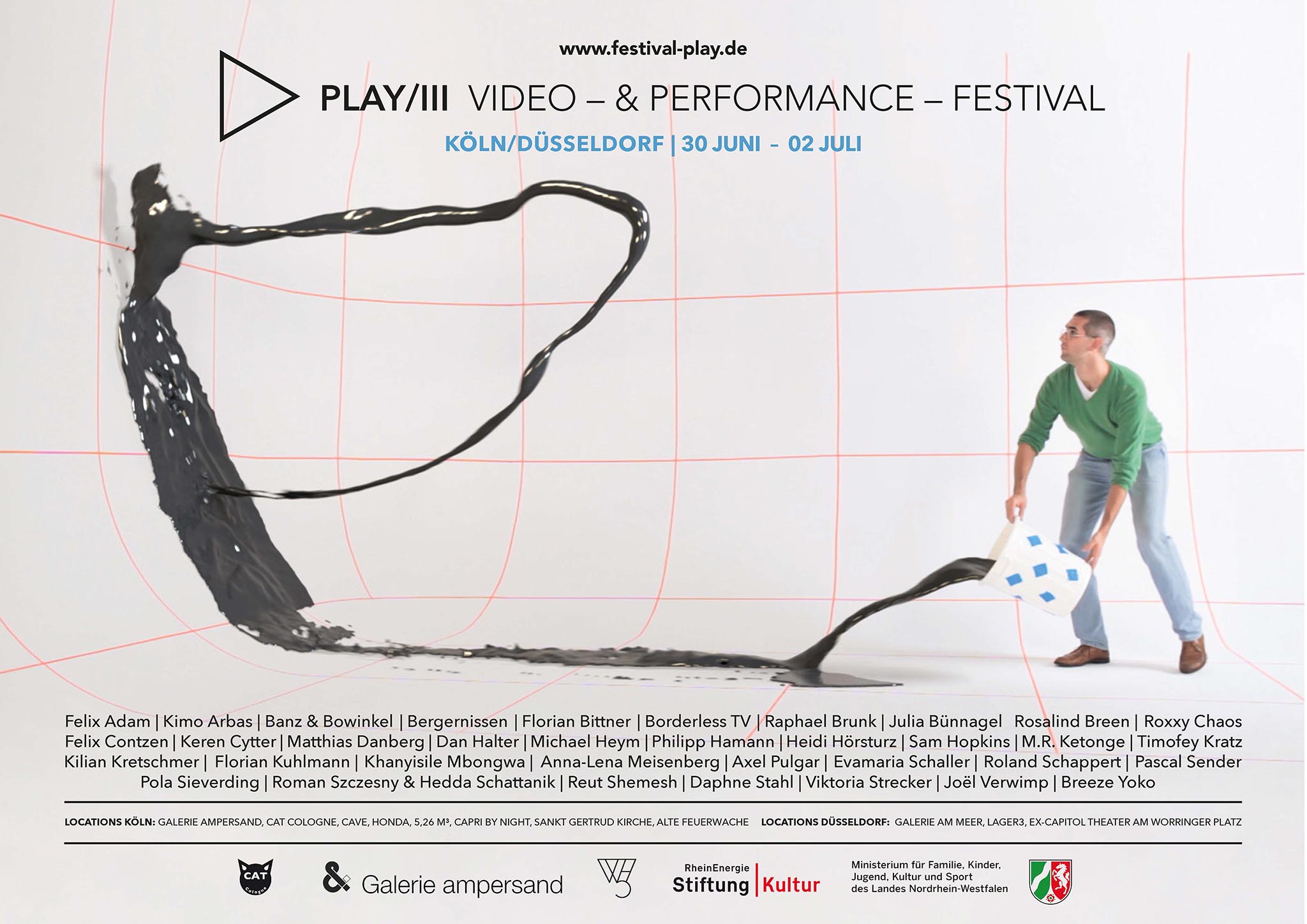 Der dritte Teil des Festivals wird sich über insgesamt elf Locations in Köln und Düsseldorf erstrecken. Die Veranstalter von PLAY/lll sind: Galerie ampersand, CAVE, CAT Cologne, Honda, Galerie am Meer und Lager3 .