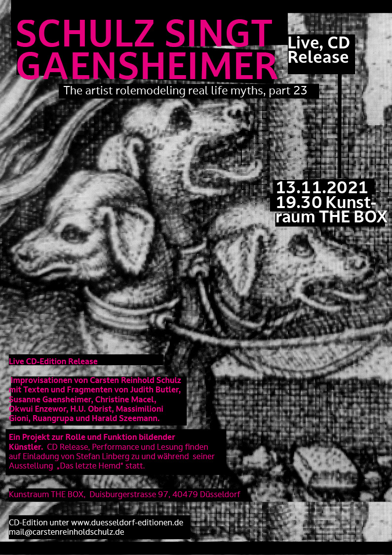 Carsten Reinhold Schulz singt Texte, Interviews und Fragmente von Judith Butler, Susanne Gaensheimer, Christine Macel, Massimiliano Gioni, H.U. Obrist, Okwui Enwezor, Ruangrupa und Harald Szeemann im Rahmen der Recherche zu den sogenannten Rollen und Funktionen bildender Künstler, ihrer siólidarischen gemeinschaft und zukünftigen, selbstgewählten Mythen in spät-kapitalistischen Gesellschaften.
