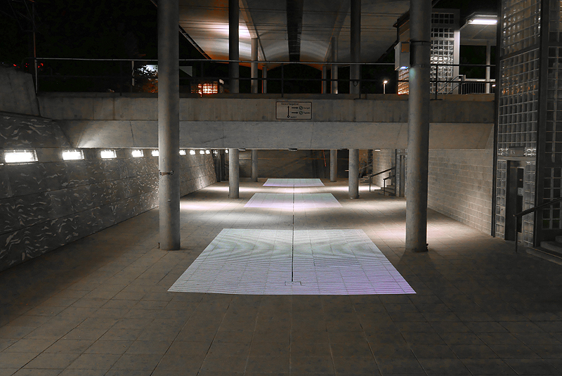 Die aus einfachen Gitterrastern bestehenden Computeranimationen bewegen sich über die weißen Wände. In den Mehrkanalinstallationen werden die Animationen mit mehreren Projektoren aneinander gelegt und so auf den Raum hin angepasst. Für den Betrachter entstehen dadurch physisch empfundene Eindrücke, das Gefühl des Fahrens und der Instabilität.