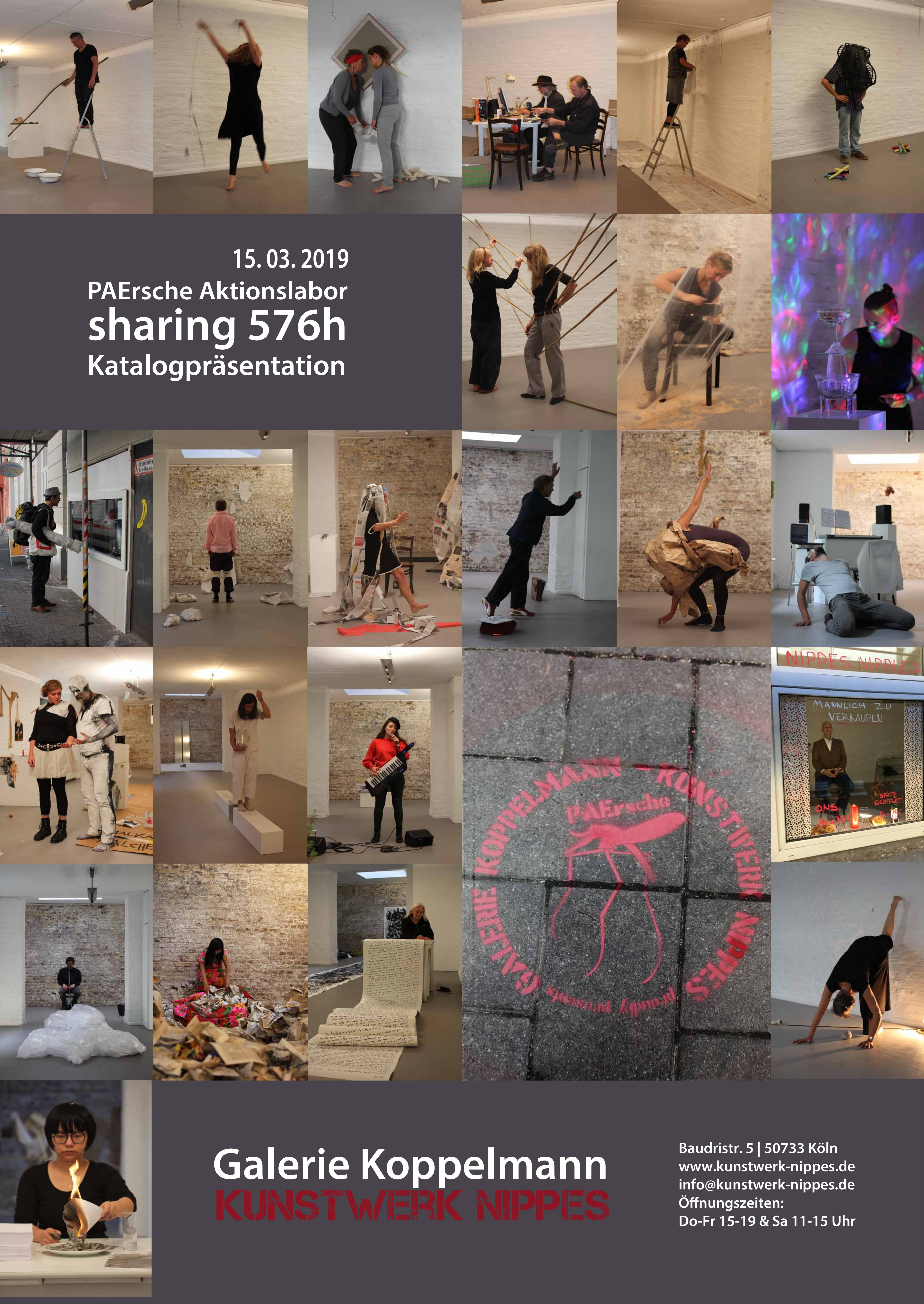 Vom 1. bis 24. September 2017 war das PAErsche Aktionslabor für 24 Tage – 576 Stunden zu Gast in der Galerie Koppelmann – Kunstwerk Nippes. Für >sharing 576 hsharing 576 h< erscheint. Wir möchten dieses Projekt und die wunderbare Zusammenarbeit des PAErsche Aktionslabors und der Galerie Koppelmann, mit der Präsentation des Kataloges, noch einmal Revue passieren lassen und gemeinsam feiern. Zur Präsentation und zum gemeinsamen Austausch mit Kollegen, Freunden und Gästen werden zahlreiche Künstler*Innen anwesend sein.