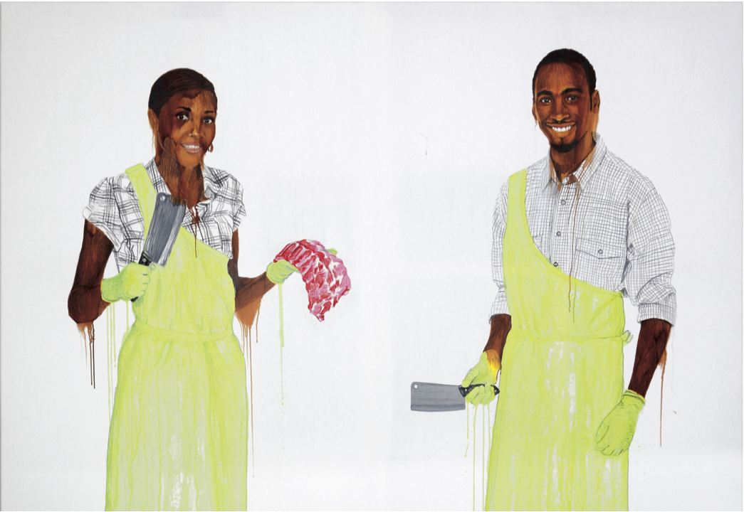 Das zentrale Diptychon EVE + ADAM zeigt ein lebensgroßes, lachendes Paar, gemalt mit Marker und Acryl auf LKW-Plane. Die biblischen Figuren Eva und Adam sind dargestellt als dunkelhäutige jugendliche Schlachter in neongelben Schürzen. (..)