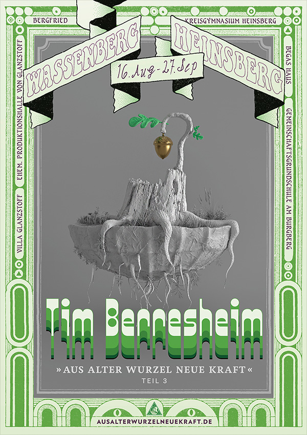Im dritten Teil der Ausstellungsreihe „Aus alter Wurzel neue Kraft“ führt Tim Berresheim einige seiner zentralen Bildmotive zurück in den Kontext, dem sie entstammen. Damit legt der in Wassenberg und Heinsberg aufgewachsene Künstler autobiografische Bezüge seines Schaffens offen und erzeugt vielschichtige Rückkopplungen zwischen dem digitalen Raum seiner Arbeiten und der Umgebung in situ. Nach Stationen in Los Angeles und Aachen mit Ausstellungen unter dem Titel „Aus alter Wurzel neue Kraft“ ergibt sich nun eine besondere Symbiose zwischen Berresheims Kunst und dem Ausstellungsort.