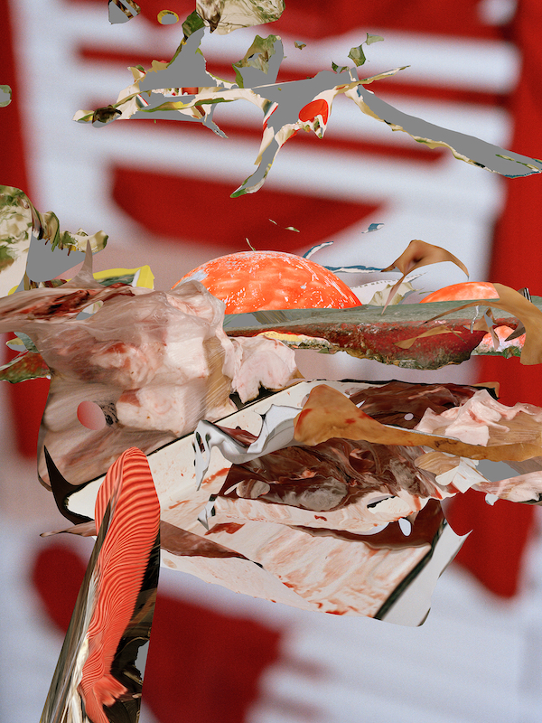 Pidust understands photography in the sense given to it by the photo-theorist Enno Kaufhold who, in his anthology, Natürlich Künstlich: Das virtuelle Bild (naturally artificial: the virtual image) (2001), referred to it as a hybrid that moves between the natural and the artificial. Her images are made up of analogue elements (photographed by Pidust herself) and digital components, where the artist uses 3D programs or allows them to work for her. For example, Pidust works with a creative software for scanning architecture and for producing digital models of rooms and spaces, by interfering with the program-immanent algorithms that are responsible for the so-called pattern recognition. This allows something new and unexpected to emerge, the process of creativity has become independent. The computer becomes a creative entity, because she uses artificial intelligence to manipulate true-to-life representations. Chance becomes a central element in the process, similar to the way colours blend together in a painting. For her montages, Pidust works with computer programs to create virtual 3D objects, into which she introduces pictorial elements from other sources, such as material that she herself has photographed. In doing so, she involves not only rigid objects, but also fluid, moving materials that she later freezes. The artist rotates the 3D objects on the computer and then produces a perspective that she ultimately transforms into a finished, two-dimensional piece of work. This gives rise to the enormous plasticity found in the pictures, that is so characteristic of Pidust’s oeuvre.