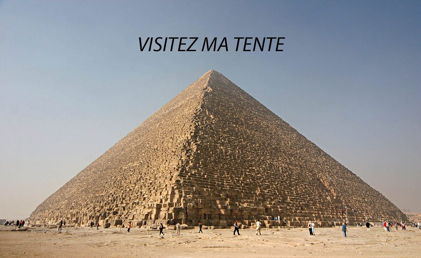 Das Zelt, als sehr kleine intime Raumeinheit, schafft mit einer simplen Konstruktion ein Innen und ein Außen und kreiert eine raumsoziologische Situation, die einen temporären „Raumbesitz“ mit gewährleistetem Schutz und unbeobachtetem Handlungsfreiraum schafft. Rein formal betrachtet, ist ein Zelt – je nach Typ – geometrisch als Pyramide zu bezeichnen. Verbindet man nun das anekdotische Visitez ma tente mit einer Abbildung der bedeutendsten Pyramide der Welt – der Cheops-Pyramide in Ägypten – entsteht ein Effekt, der aus der Werbebranche bekannt ist: Der eigentlich falsche Zusammenhang von Wort und Bild, erscheint durchaus möglich und weckt eine illusionäre räumliche Verknüpfung des zur Bauform gehörigen Interieurs und erzeugt eine Imagination von leiblicher Anwesenheit. Die bildliche Zuschreibung der von außen abgebildeten Pyramide als „mein Zelt“ ruft ein fantastisches Raumerleben hervor, das den Gedanken an ein unspektakuläres beengendes Zelterlebnis untergräbt und den dem Menschen innewohnenden Größenwahn reichhaltig nährt. Während die „Zelterfahrung“ für jedermann zugänglich ist, gestaltet sich die „Pyramidenerfahrung“ als weitaus komplizierter. Und trotzdem sind beide Raumerlebnisse aufgrund derselben geometrischen Beschaffenheit und dem Wissen um Material und Konstruktion gleichsam vorstellbar. Die Form und die personale Zuweisung gestatten dem Selbst auch ohne empirische Grundlage, sich in einer überdimensionalen Atmosphäre wiederzufinden. Die Imaginationsfähigkeit des Geistes verknüpft also ganz selbstverständlich den banalsten Raum mit dem über alle Räume erhabenen Wunder und macht sich das vorgestellte Interieur ohne Hemmung zu eigen.