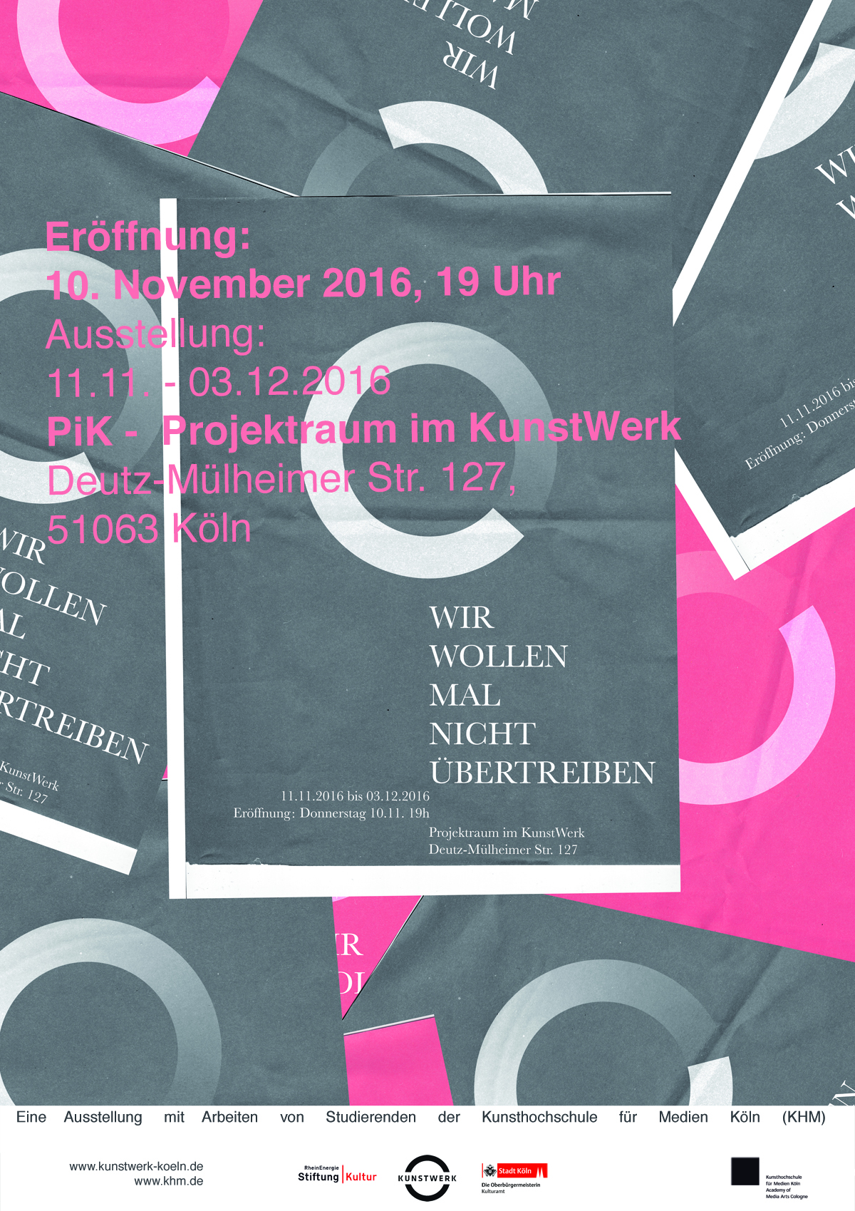 Unter dem Titel WIR WOLLEN MAL NICHT ÜBERTREIBEN präsentieren 18 Studierende des Seminars „urban stage ff.“ von Prof. Mischa Kuball an der Kunsthochschule für Medien Köln ihre Arbeiten im PiK. Das Format der Ausstellung ist dabei thematisch offen und die verwendeten Medien vielfältig. Die Bandbreite der Arbeiten reicht von Zeichnungen über Fotografien, Videos, Installationen und Performances. Parallel zur Ausstellung im PiK wird ein Messestand auf der Cologne Fine Art (COFA, 17.11 – 20.11.16) bespielt.